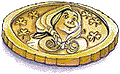 Moeda de prata com a face de Tymora, cercada de trevos.Portifólio: Boa sorte, habilidade, vitória,
