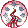 Círculo de sete estrelas azuis claras com uma chama vermelha