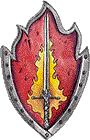 Uma espada prateada flamejante e um escudo vermelho sangue.